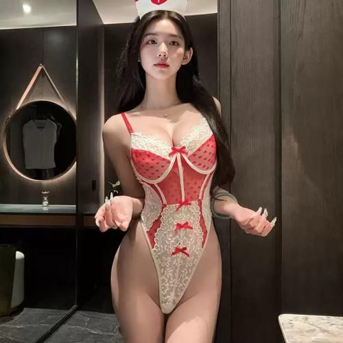 超ハイレグの透け素材が思い切り開放的な時間を生み出すナース風テディ(TEDDY)。赤いハート柄のチュールレースに小さな赤いリボン、白レースのコントラストがフェミニンで刺激的な超ハイレグテディ。腰深くから入ったハイレグは太ももを大胆に露出し、食い込んだヒップやスケスケのバックスタイルも必見です。裏地の入ったブラはワイヤーがバストを優しく持ち上げスタイルアップにも期待。セットのカチューシャを身に着けると一気にナースコスプレへ早変わり♪